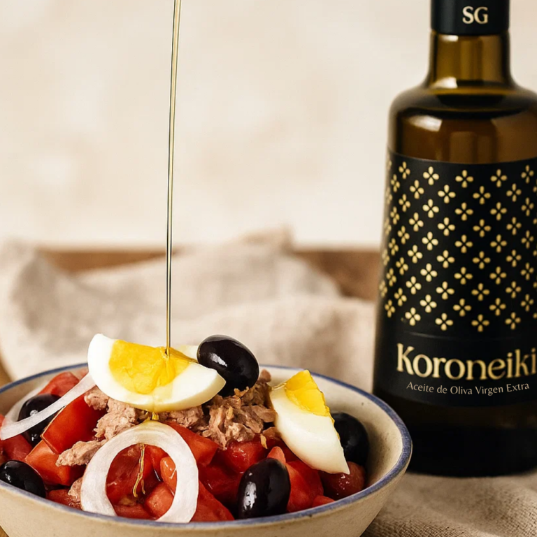 Ensalada murciana tradicional con tomate, atún, aceitunas, huevo y el inconfundible toque del aceite Koroneiki Los Sabores de Tomás.