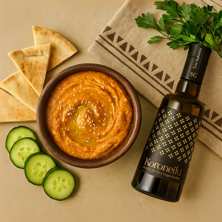 Coronado con sésamo tostado y un hilo generoso de aceite de oliva virgen extra Koroneiki.